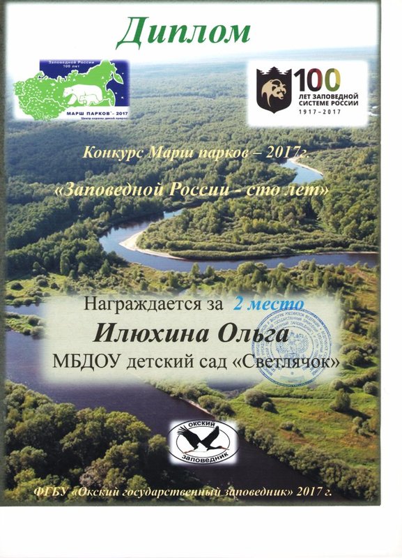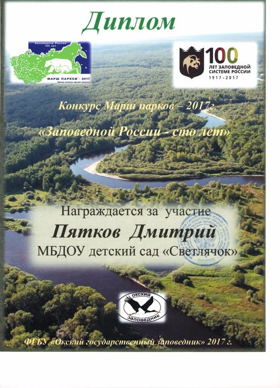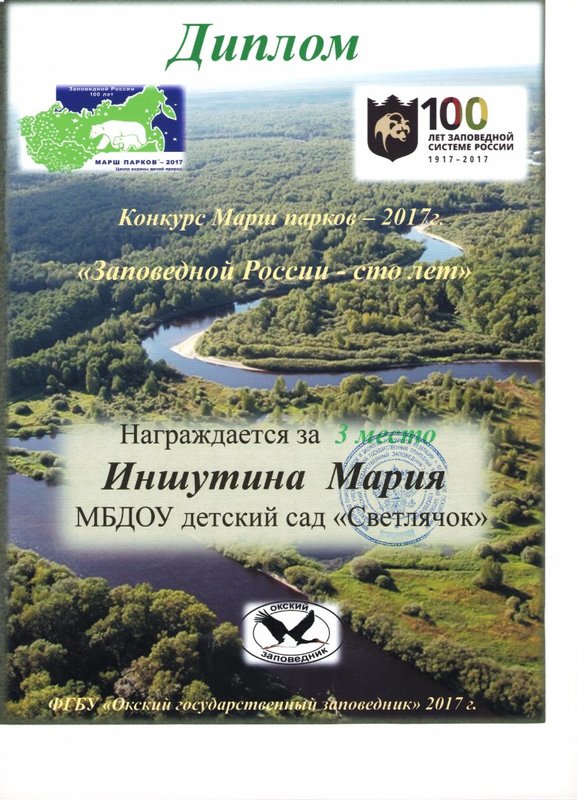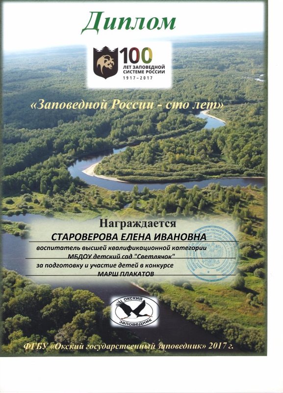 В рамках акции «Марш парков» и традиционного конкурса «Мир заповедной природы» в Окском заповеднике был объявлен детский конкурс плакатов «Сохраним заповедную культуру». И как мы уже писали, дети подготовительной к школе группы ( на тот момент) приняли участие.