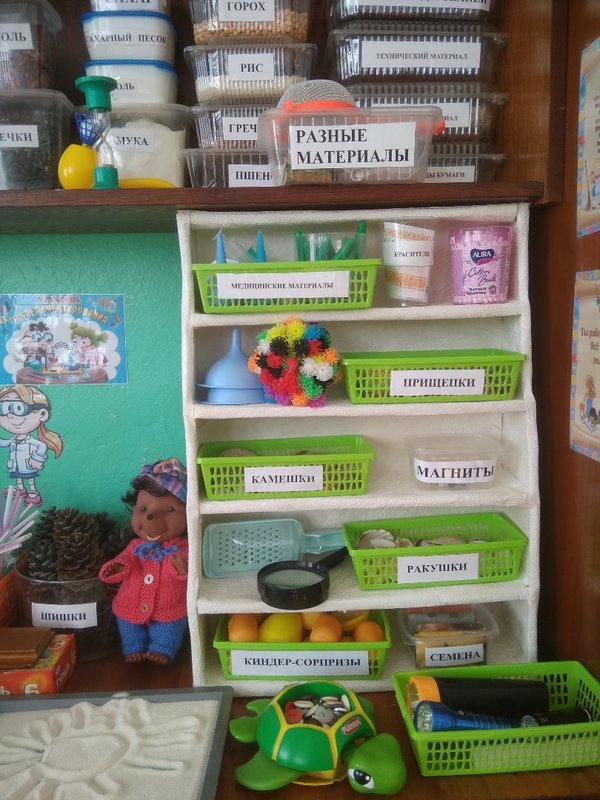 В нашем уголке есть хозяин – ученый ежик. От его лица создаются проблемные ситуации, задаются вопросы. Он помогает детям в экспериментировании: присылает описания опытов, подготавливает нужные материалы к занятию, учится вместе экспериментировать.