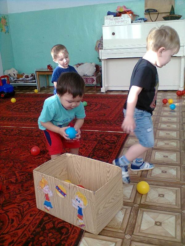 Особенно нравится детям играть в игру "Непослушные мячики", где пластмассовые мячи раскатываются по группе, а дети их собирают в коробку. Радость и восторг приносит игра, одновременно в игре дети упражняются в ходьбе и беге.