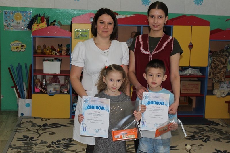 Андрей и Василиса получили дипломы участников конкурса творческих работ. А Козлова А.Н. - начальник отдела общего среднего и дошкольного образования, председатель районной организации Профсоюза работников образования вручила дошкольникам сладкие подарки шоколад "Россия".