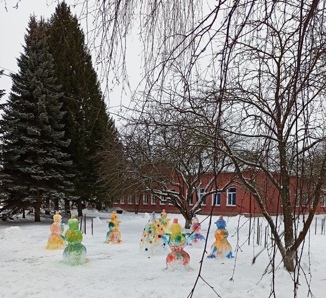 А в ночь на 30 число произошло чуд – во дворе музея появились Снеговики. Они были белые, похожие друг на друга. И грустные, потому что каждый из них хотел быть красивым и веселым.